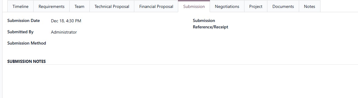Record submission dates, methods, references, and responsible users. Always know when, how, and by whom a tender was submitted—especially when accountability matters.