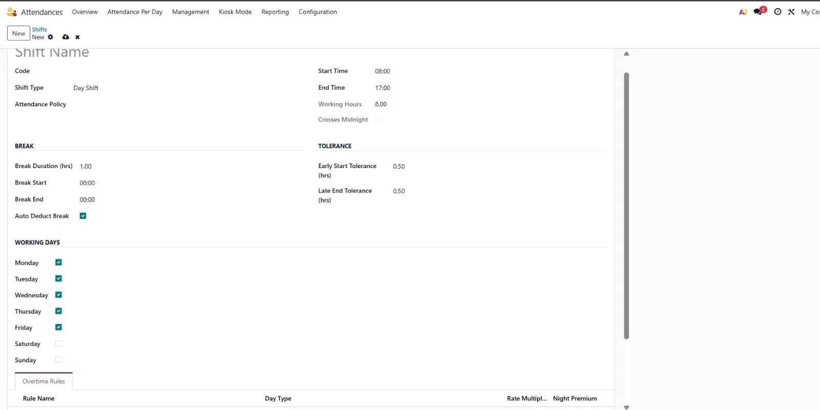 Create day, night, or rotating shifts, define break times, and apply overtime rules automatically — the system does the calculations for you.