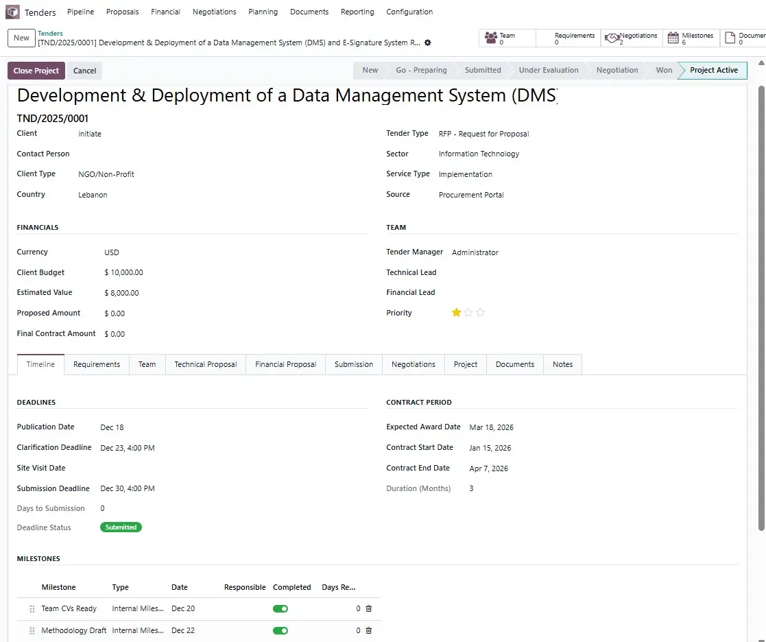 Record submission dates, methods, references, and responsible users. Always know when, how, and by whom a tender was submitted—especially when accountability matters.
